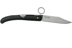 La Cold Steel Kudu 20KK es una extraordinaria navaja, con fuertes raíces sudafricanas. Destaca el gran llavero sobre el pivote. Forma parte del llamado «cierre de anillo». Tirando del anillo se desbloquea la cerradura. Puede que te cueste acostumbrarte al principio, pero cuando lo hagas, será pan comido. Hemos observado que la siguiente técnica es la que mejor funciona: Coloca el dedo índice en el anillo, el pulgar en la hoja y utiliza los dedos corazón y anular para apoyarte en el lomo del mango. Tira del dedo índice y el cuchillo se desbloqueará.