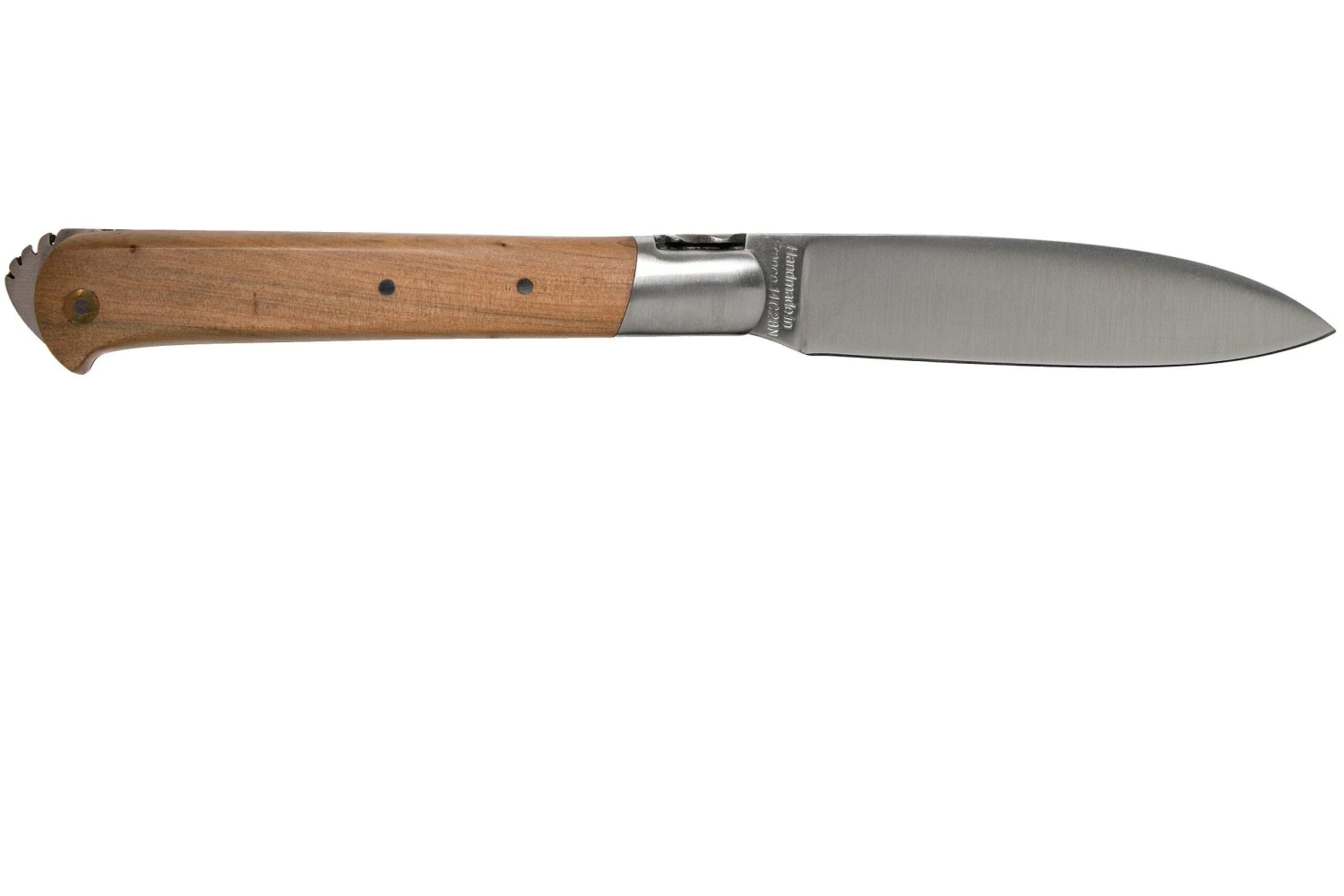 La colección «5 Coqs» de Fontenille Pataud debe su nombre a un pequeño pueblo, Yssingeaux, en Francia. Se pronuncia como «i-sin-jo» y significa, en el dialecto local, «cinco gallos jóvenes». Los gallos no aparecen únicamente en el nombre de la serie de cuchillos. La hoja también presenta un gallo estilizado. El número «5» está bellamente realizado en forma de gallo. Y el dorso del cuchillo recuerda bastante a la cabeza de un gallo con cresta. Presta atención a los ojos del gallo, que presentan dos colores. Fíjate también en el esquilón de perlas que se ha añadido a la «mosca» alternativa, que tiene una forma casi de Ankh eqipcio.