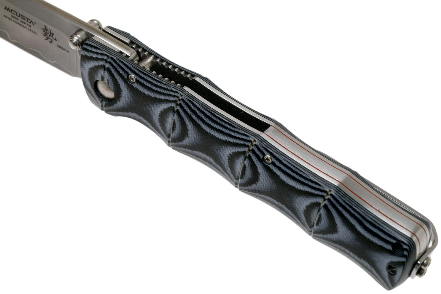 La Mcusta MC-0201G Minari Shinra Maxima es una navaja Mcusta de gran tamaño y estilo. Perfecta para quienes prefieren cuchillos de caballero ligeramente más grandes. Destaca el impresionante mango de micarta. Este cuchillo está mejorado con lo que Mcusta llama un patrón de bambú. Esto significa, literalmente, que el mango tiene la forma de un trozo de bambú. No solo tiene un gran aspecto, sino que también ofrece suficiente agarre. El cuchillo se puede abrir fácilmente por usuarios zurdos y diestros con el perno pulgar anodizado azul. El bloqueo liner-lock garantiza que la hoja no se cierre cuando no lo desees. También puedes cerrar el cuchillo con una sola mano. Esta versión está mejorada con una notable hoja con núcleo de acero pulverizado SPG2. Un tipo de acero extremadamente duro que conserva bien su filo. El núcleo está laminado entre dos capas de acero más blando. Como tal, te puedes beneficiar de la dureza del núcleo y de la flexibilidad del acero laminado. Cuando se abre, la hoja se bloquea mediante un linerlock.